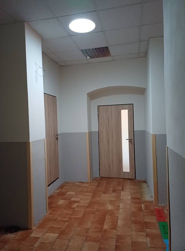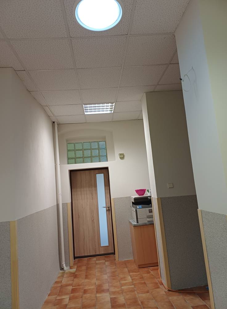 Nové dveře, staré dřevěné obložení nahradila světlá omyvatelná omítka, vymalováno a hlavně nový světlovod, který rozzářil horní chodbu školy.